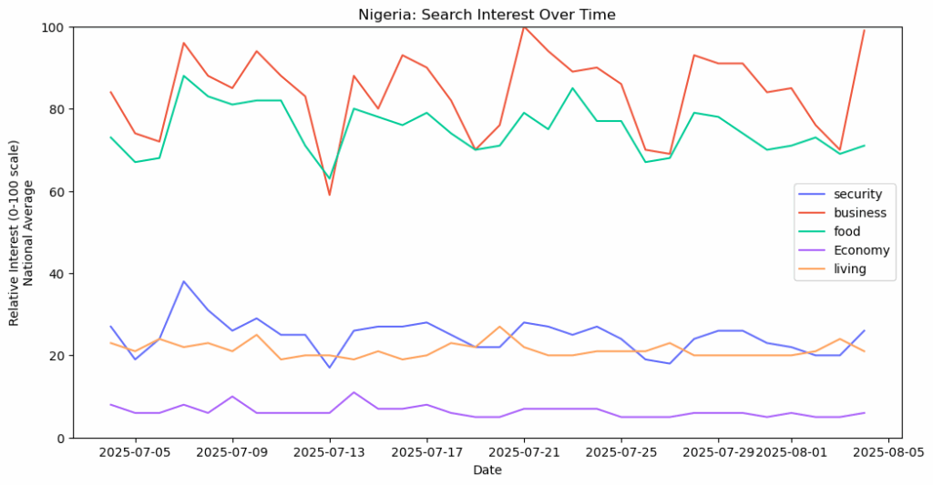In today’s data-driven world, Google Trends provides valuable insights into what people are searching for online. We present a spatial view of what Nigerians are searching for online. By analyzing trends in security, business, economy, food, and living conditions, in the states of Nigeria, we can uncover patterns that help policymakers, businesses, and individuals make informed decisions.